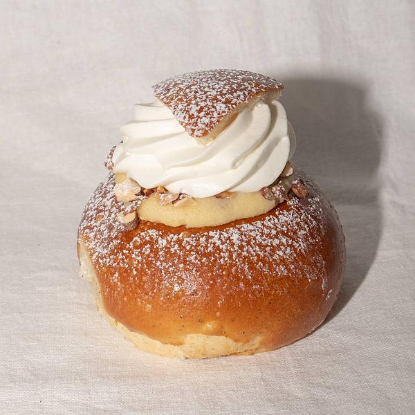 Delikatna drożdżowa bułka z kardamonem, nadziana masą migdałowo-marcepanową z kawałkami prażonych migdałów, żelką malinową, udekorowana lekko ukwaszoną bitą śmietaną.