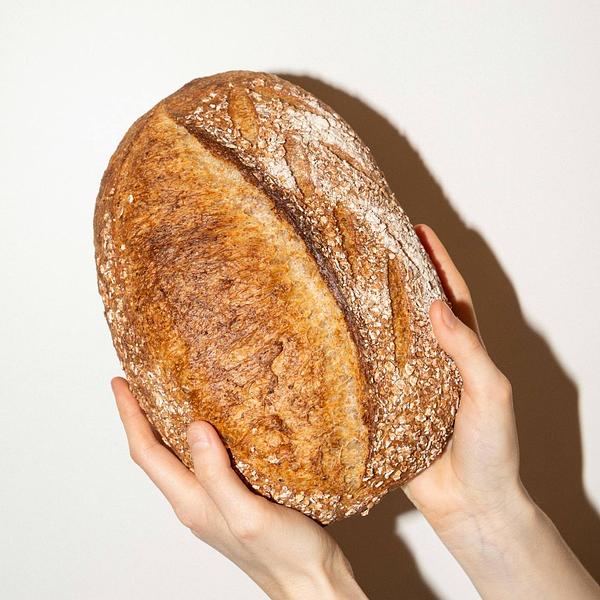750 g Chleb na zakwasie dodatkiem pradawnych odmian pszenicy (orkisz, samopsza, płaskurka). Zawiera 30% mąki razowej. Bochenek obtoczony w maku i białym sezamie.