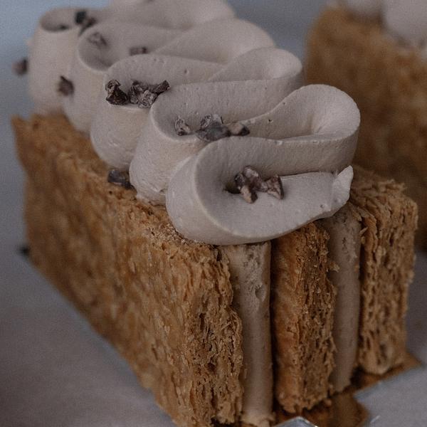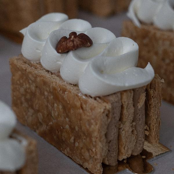 Klasyczny deser francuski - kremówka na domowym DEJowym cieście francuskim z maślanym kremem z orzechów pekan, gorzkiej czekolady, aromatycznym сointreau i puszystym kremem z białej czekolady.