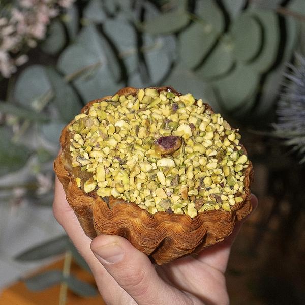 Nasz klasyczny croissant zapieczony z maślaną masą z prażonych pistacji i jeżynami.