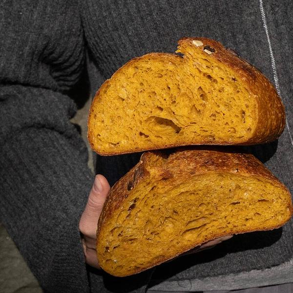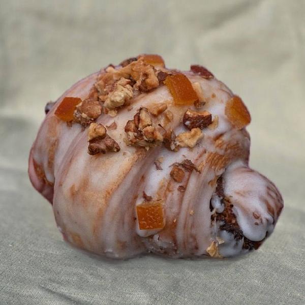 Ciasto półfrancuskie zapieczone z nadzieniem na bazie białego maku, masła palonego i marcepanu, z dodatkiem prażonych orzechów włoskich i migdałów, domowej kandyzowanej skórki pomarańczowej i rumu, wykończone lukrem z wodą z kwiatów pomarańczy.