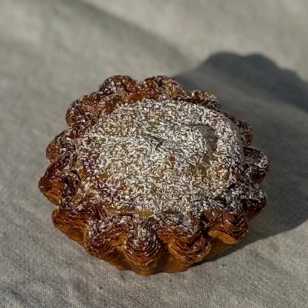 Drożdżówka z nadzieniem maślano-kardamonowym, posypana cukrem ze świeżo mielonym kardamonem.