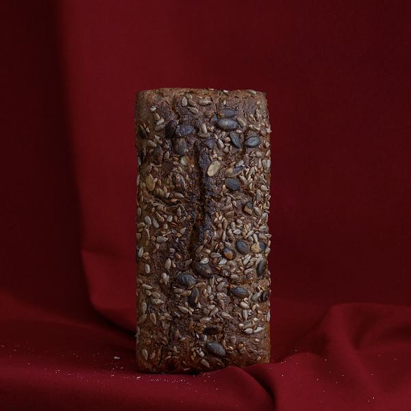 1000 g Chleb żytni foremkowy na zakwasie z dodatkiem ziaren : słonecznik, peski dyni, siemię złote, siemię brązowe.