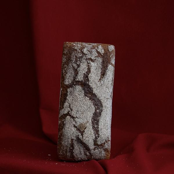 750 g Chleb pszenno-orkiszowy na zakwasie z dodatkiem prażonego orzecha laskowego i wiśni kandyzowanej. Zawiera 15% mąki orkiszowej razowej.