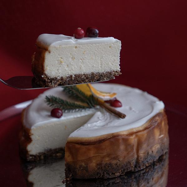 1100 g Kremowy sernik na najlepszym twarogu śmietankowym z mleczarni Strzałkowo, aromatyzowany wanilią i skórką pomarańczową na maślanym spodzie z pierniczków i prażonych orzechów włoskich.