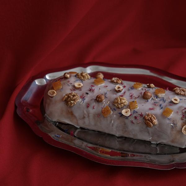 800 g Puszysty makowiec na cieście drożdżowym z nadzieniem na bazie niebieskiego maku, masła palonego, miodu, migdałów, orzechów włoskich i laskowych, z dodatkiem rumu, marcepanu, wiśni kandyzowanych i domowych kandyzowanych skórek z pomarańczy i cytryny; oblany lukrem na bazie maślanki.