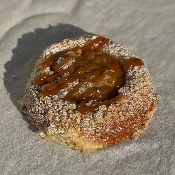 Drożdżówka z nadzieniem maślano-cynamonowym, posmarowana po wypieku korzennym syropem z Aperolem.