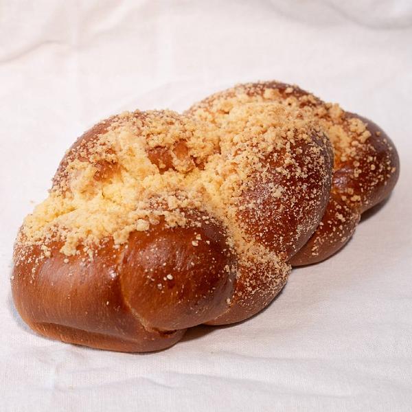 300 g Maślana chałka z kruszonką, z ciasta bogatego w masło, jaja i mleko.