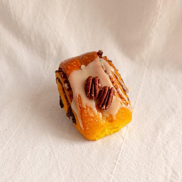 Dyniowa cynamonka roślinna z nadzieniem daktylowym z pekanami, oblana lukrem z syropem klonowym.